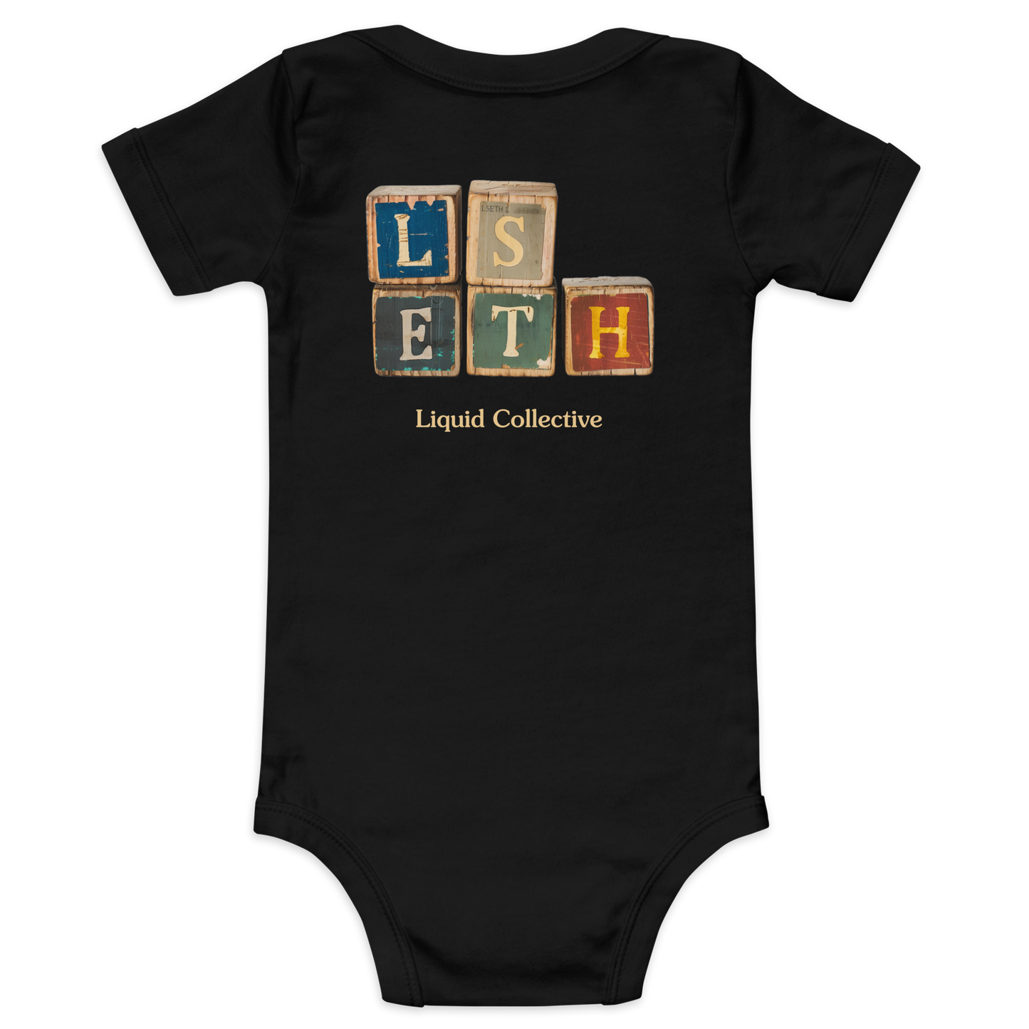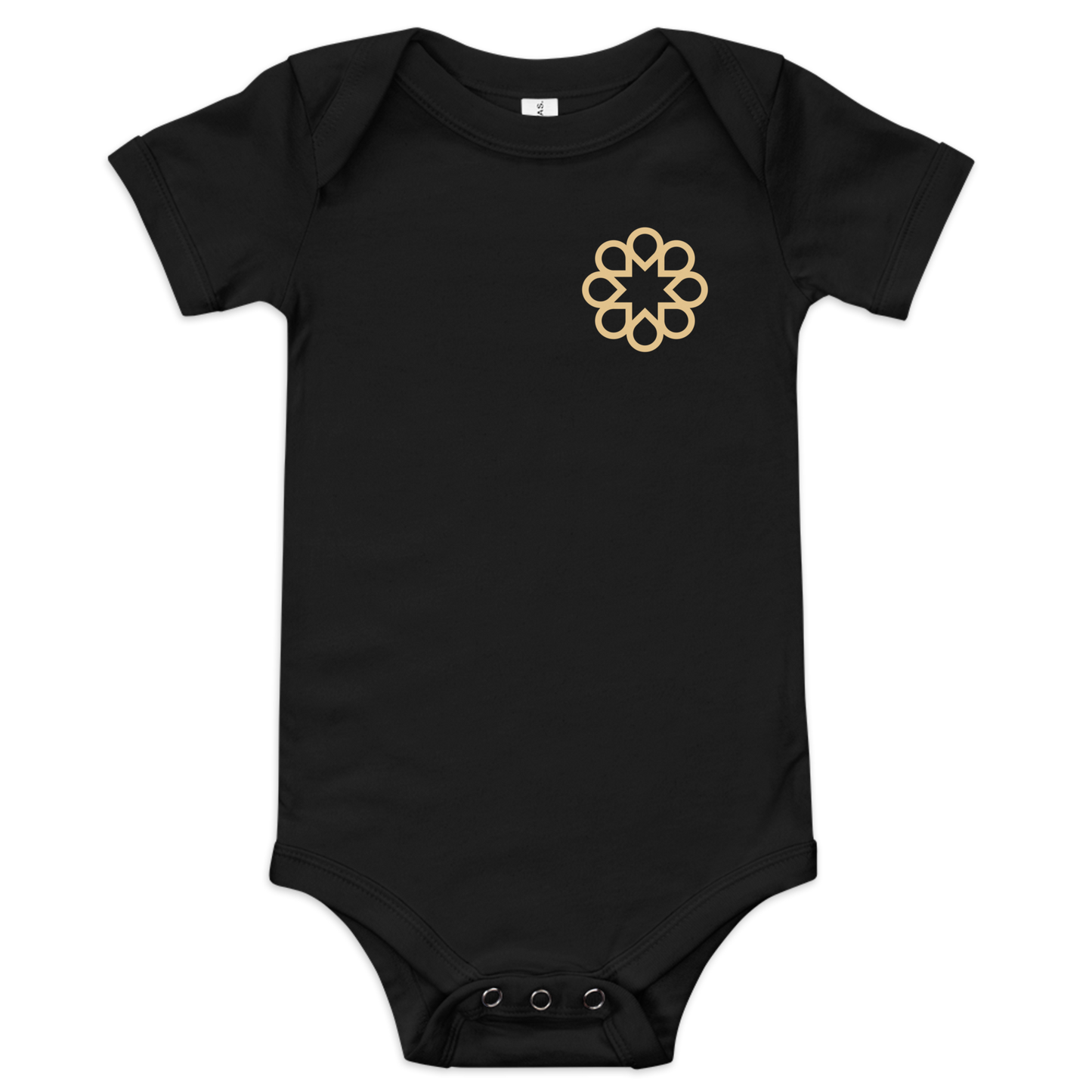 100% cotton one piece with three snap leg closure for easy changing, and a comfortable envelope neckline.